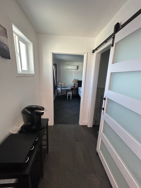 The unit includes a furnished bedroom setup, mini fridge, coffee station, and space for light food prep. Ideal for someone who prefers a quiet, self-contained environment.