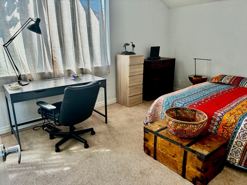 Very spacious, sunny room, furnished with new curtains, newly cleaned carpet. Every street in the neighborhood is a cul-de-sac except one, so there is literally no traffic. There are beautiful lighted walkways throughout the neighborhood with a pretty park right in the middle. Park right in front of the house; walk to three large shopping areas with shops, restaurants, Ralphs, Trader Joe's, DIY and a movie theater. You don't even need a car! Roommates are professionals who are quiet and keep to themselves. You'll feel as if you have the house to yourself!