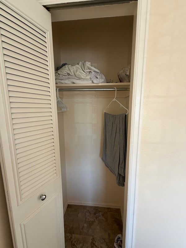 - The bedroom is in the first 3 pictures. It is 10 feet, 8 inches by 10 feet, 2 inches. The closet is 33 inches by 24 inches. The bedroom window is east facing so it gets the most sunlight. Apartment is 767 sq ft in total size.