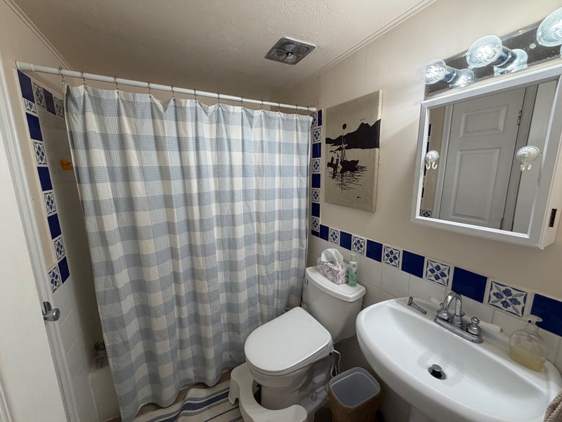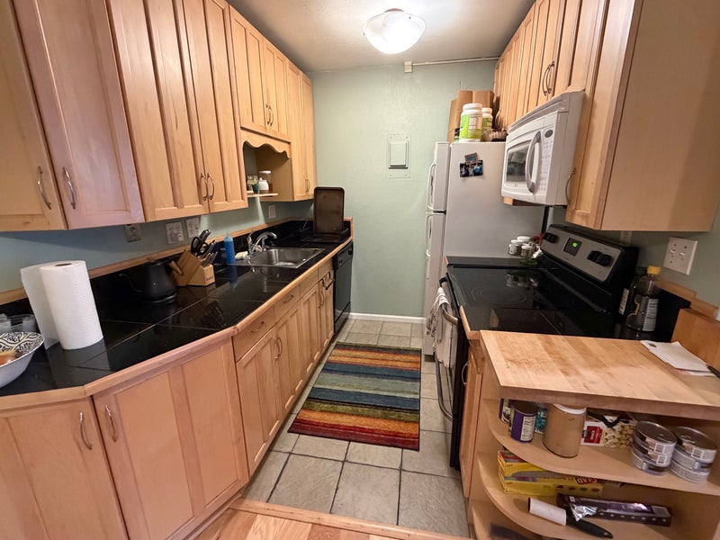 - The remainder of the apartment, shared with me, is also pictured: bathroom, kitchen, living room, and patio. There is a shared laundry inside the building, and it's conveniently located across the hall.