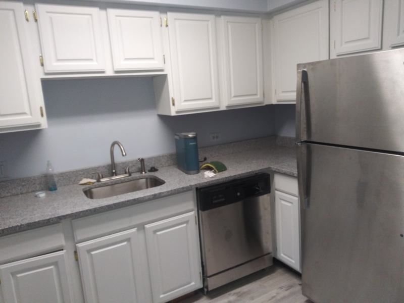 The kitchen features new appliances including a dishwasher, fridge, and granite countertops. The bathroom is designed with modern fixtures, a spacious vanity, and a bathtub. The building includes shared laundry and secure entry with surveillance.