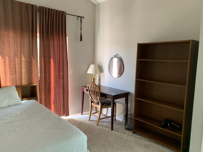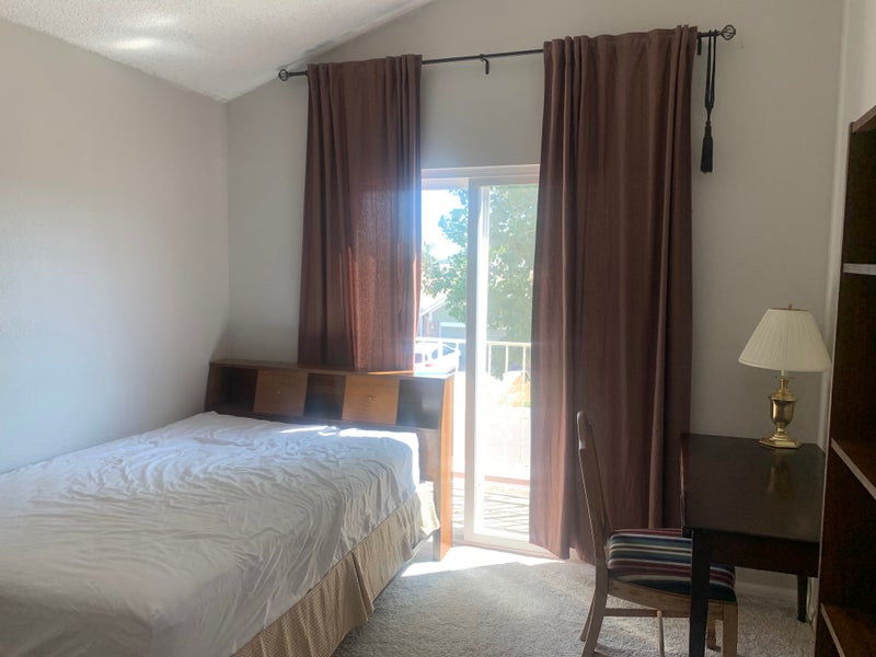Your bedroom comes fully furnished with essential furniture. It also features a vaulted ceiling and private balcony overlooking the peaceful front yard.