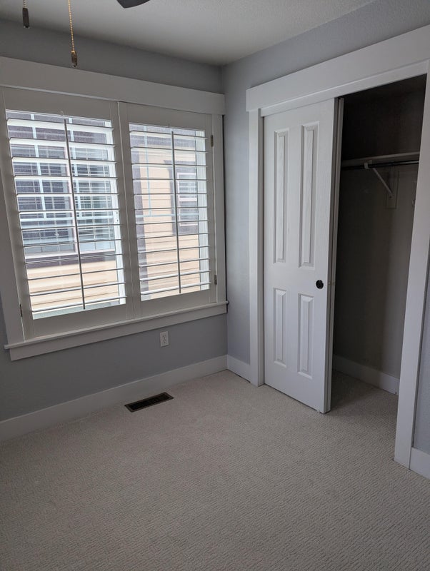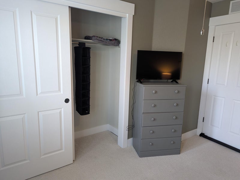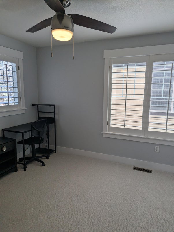Bedroom two has a desk, office chair, a small cabinet, and a closet, but I can move a bed and different furniture into this bedroom if I find two roommates who aren't a couple.