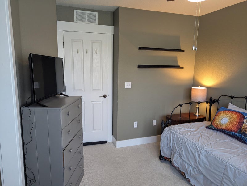Bedroom one is east-facing with blackout curtains, a daybed and trundle, nightstands, lamps, dresser, t. v. with Netflix and Prime, and a large closet.