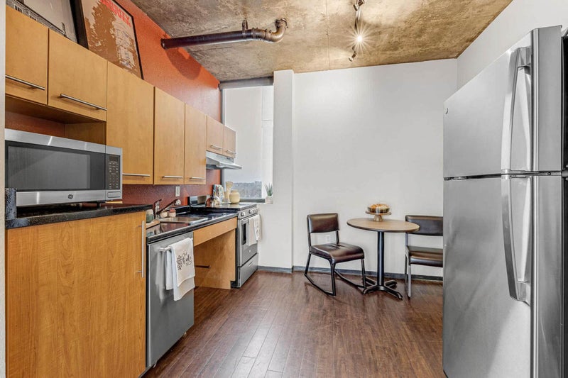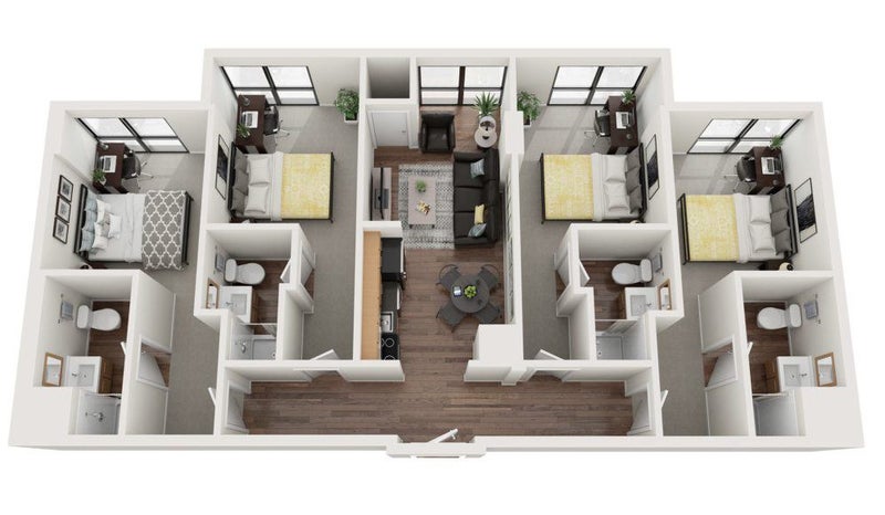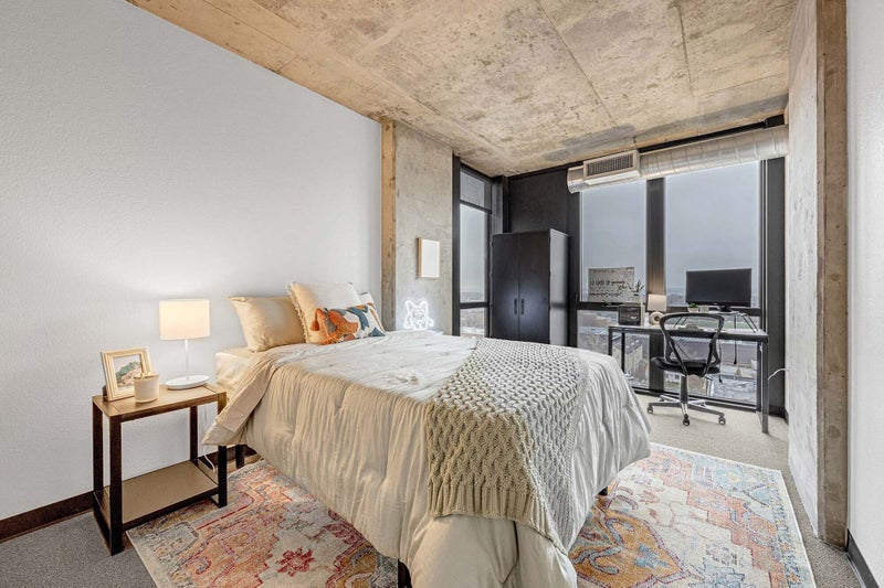 Full furnishing in each room (bed, desk, chair, storage), individual bathrooms, furnished living room (couch, tv, table) and a full kitchen with newly upgraded appliances. Each room has floor-to-ceiling windows.