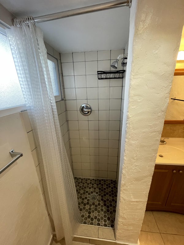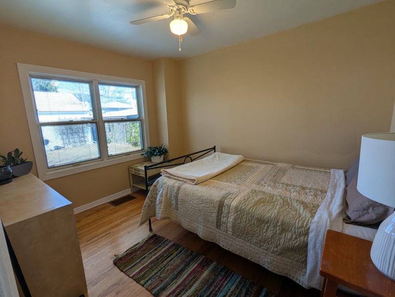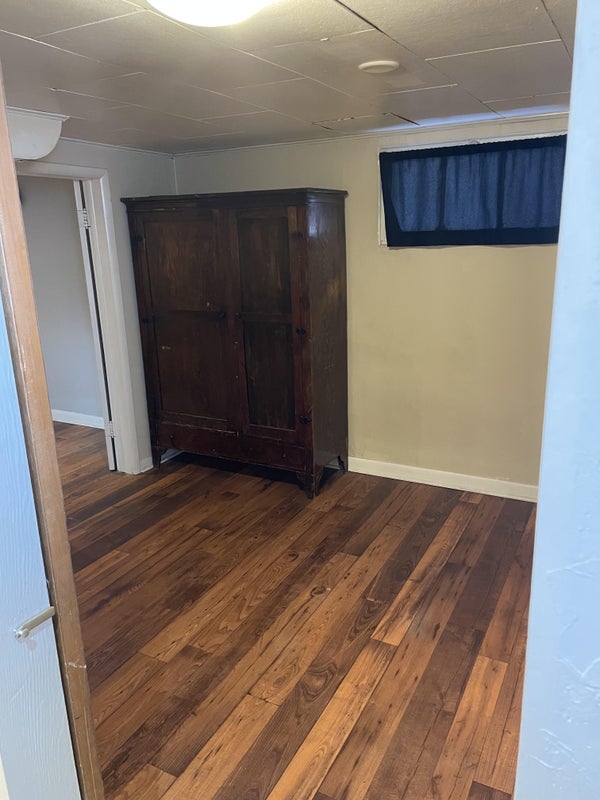- OR downstairs bedroom, 9x11, with private bathroom, and wardrobe for closet. Ideal for someone who likes a cooler, dark room for sleep or who works night shifts.