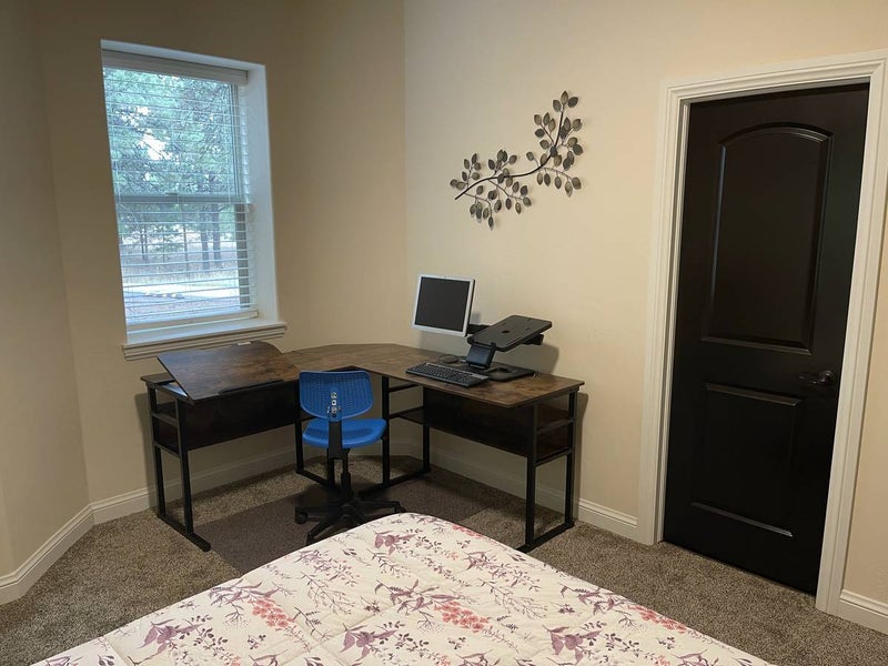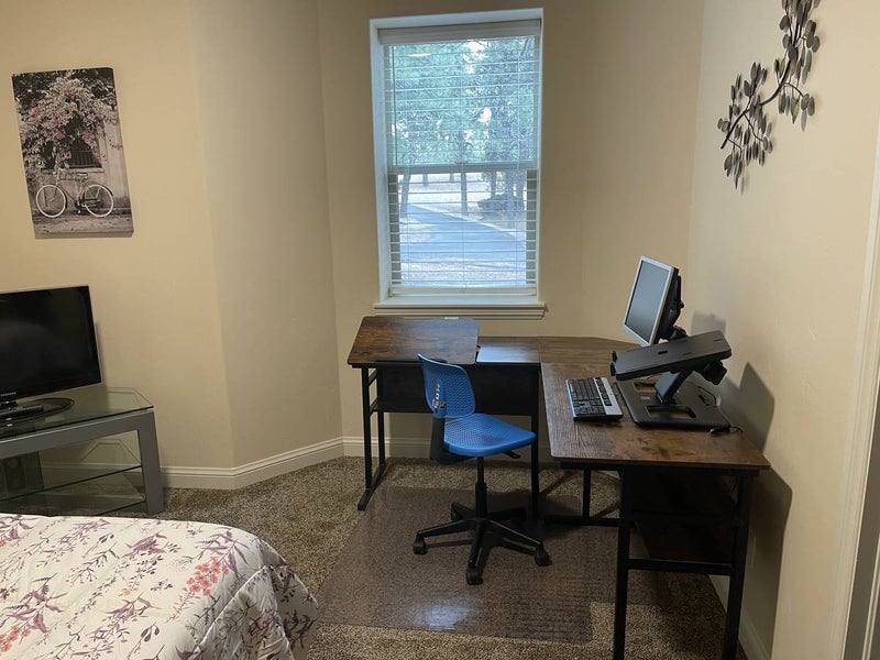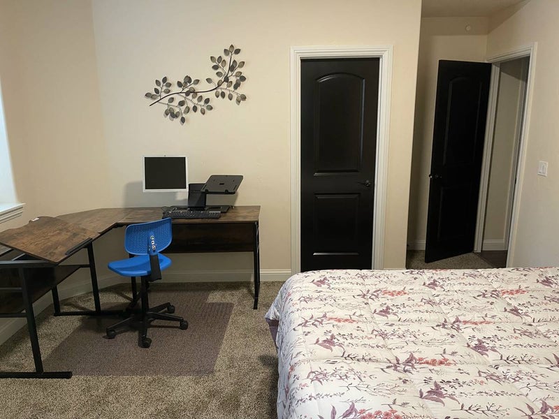 - 12x12 Room with a full bed and SLEEP NUMBER-type mattress (includes remote control). - New desk and office chair, with monitor and HP Printer/scanner/copy machine for your work, it has connections ready for your laptop. (we can remove them if not required) - Walk-in 5x5 closet. - Access to Jack & Jill bathroom (shared with room 2).
