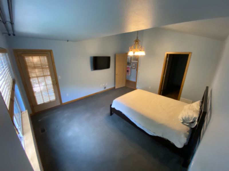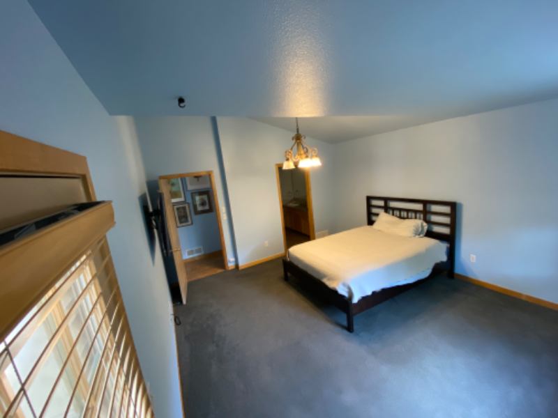 Quiet back bedroom (15x13.7), featuring an en suite bathroom, walk in closet, private access to the backyard and valued ceilings. A large back window allows light to pour in, overlooking the garden.