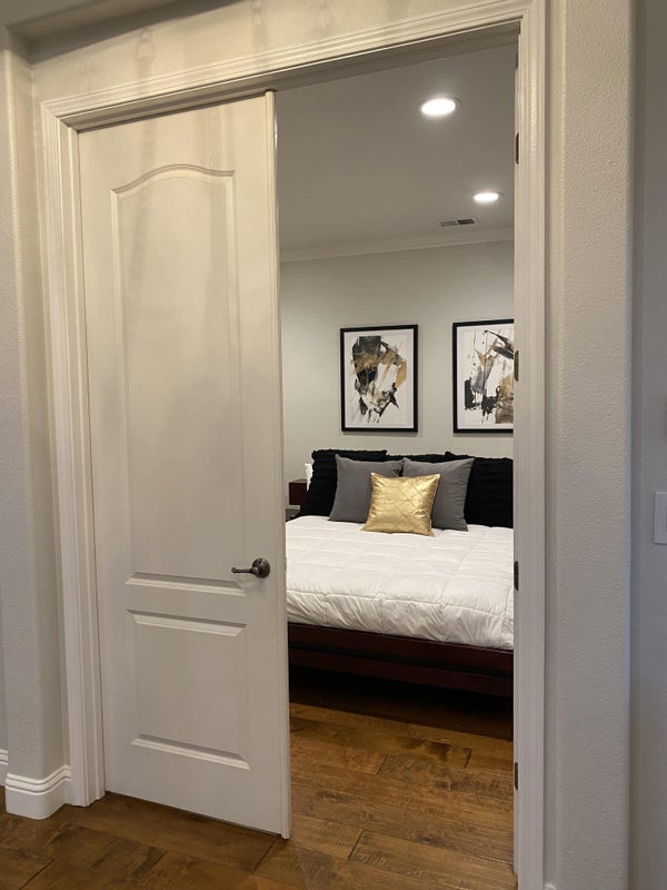 The room is large and keyed with a king sized bed and 60" TV, It's on the first floor when you first enter the house.