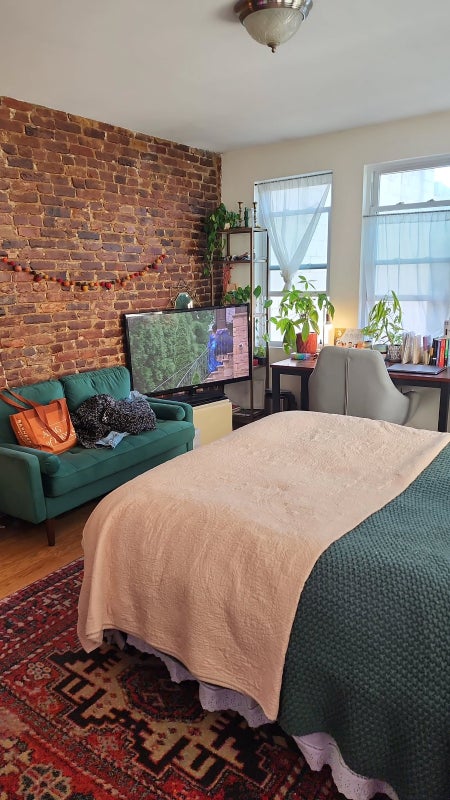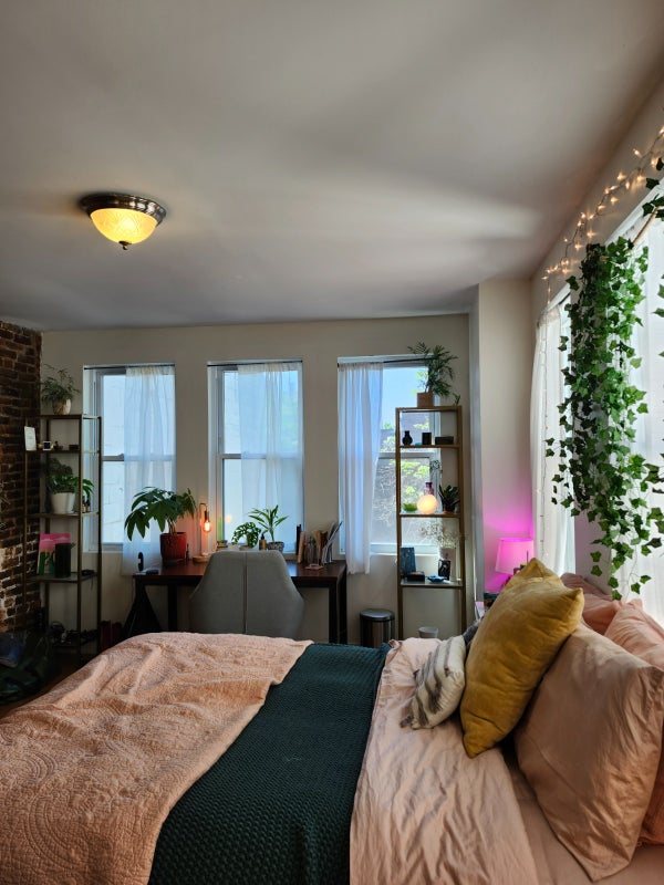 The bedroom is on the top floor, and receives plenty of sunlight. Rent is $1,133 per month including utilities (internet is an additional $20 per housemate). The bedroom is very spacious, and can fit large furniture items including a couch, desk, bed, book shelves, and a dresser. The room comes with its own private bathroom.