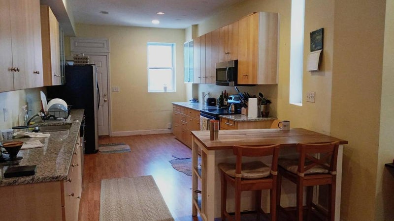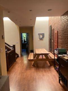 The living room and kitchen are located on the second floor, and is a very large space. The house has many lovely features including exposed brick, a wooden staircase, and skylights. The backyard is private but shared with the downstairs neighbor.