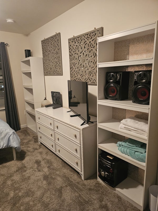 Large furnished room on the upper level of our Luxury Townhouse with a living room & restroom on the same floor. Utilites included. Gym, pool & off street parking included. We are a young at heart older couple with a very loving Yorkie dog. Kitchen and washroom use available. Home is very close to Restaurants, stores & golf course with a restaurant.