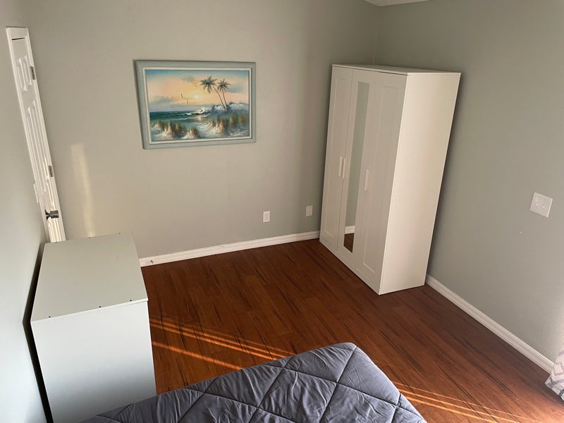 The room includes a secure passcode door lock and access to a shared bathroom, full kitchen, washer and dryer, and backyard. Ideal for clean, quiet, and responsible individuals.