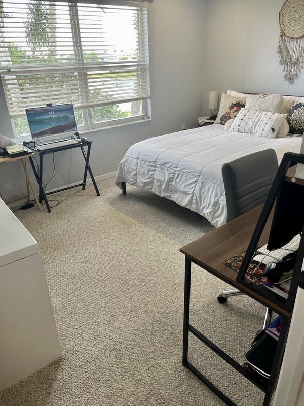 Large Furnished Room and Private Bathroom! House is within a gated community with pool, house totals 2800 sq ft. with 5 bedrooms and 3 bathrooms. There are 2 other roommates living in the house, one male and one female. Property is right on the water with a beautiful view from common areas. Large room also has direct water view and includes large private bathroom, driveway parking, as well as access to beautifully renovated living areas & kitchen. Utilities are included in $1400 price.