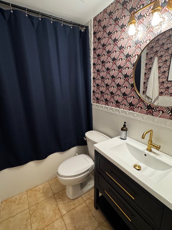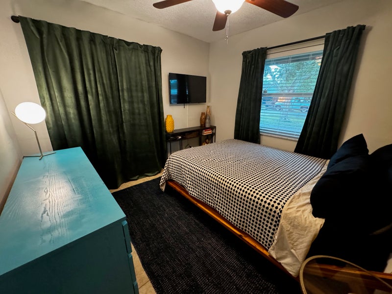The room includes a queen bed, TV with streaming services, dresser, large closet, and blackout curtains. You’ll have an almost private bathroom (only shared occasionally with guests).