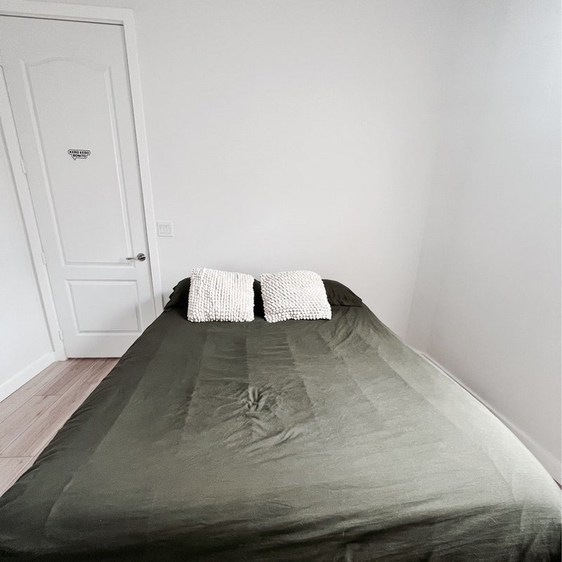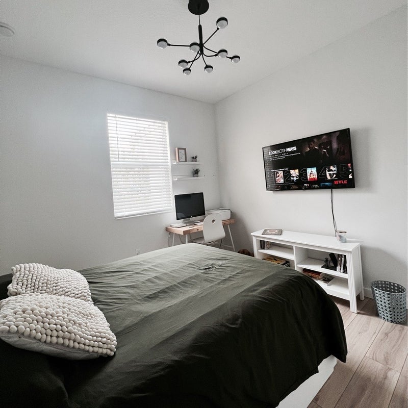 Spacious, fully furnished private bedroom with its own bathroom (alkaline water) in a clean, quiet home The room includes a mounted TV, bed, desk/workspace, and modern finishes. Plenty of natural light and closet space.