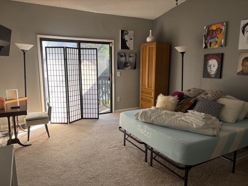 Spacious private room with a balcony offering serene views of the lake and surrounding trees. Fully furnished and features a private en-suite bathroom, mirrored dressing area, and a generous walk-in closet. High-speed WiFi and television included.