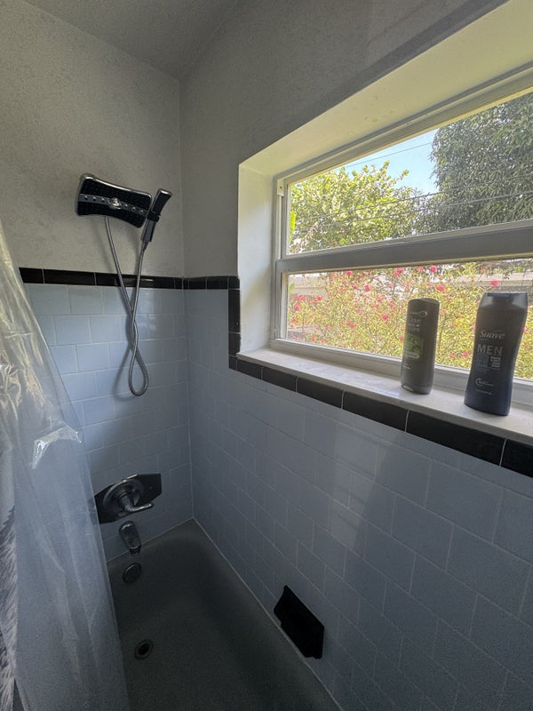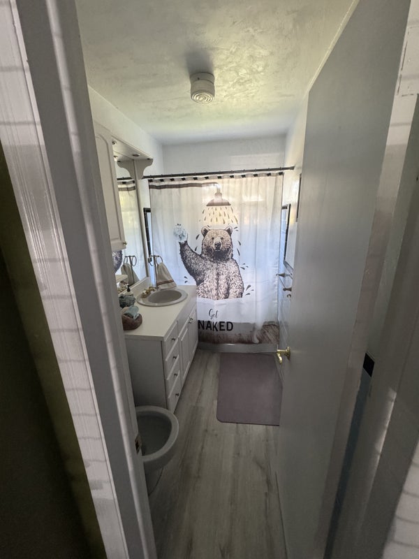 The bath features a tub and adjustable shower head cabinets space as well.