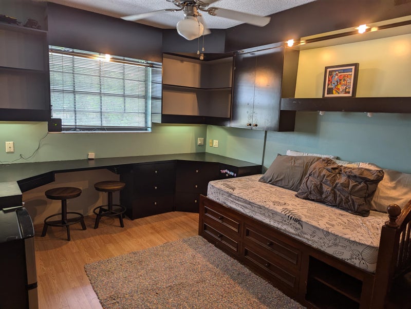 Fully furnished 1 BR/Den/Bath for rent in our large Plantation lake home. The rooms are on the 2nd story. The Den can be used as your living room and kitchenette, and access to the common areas of the home is included. Common areas include laundry, back patio, swimming pool, game room w/pool table & air hockey. All utilities, including TV & internet are included. The rental is intended for 1 person, but would consider2 for additional $150 per month. Would also consider short term rental at $400 per week. I have a small dog and a cat, but no other pets are allowed. Someone who maintains similar hours is preferred (M-F 9-5 work/school). A background check will be needed as well as references from prior leases.