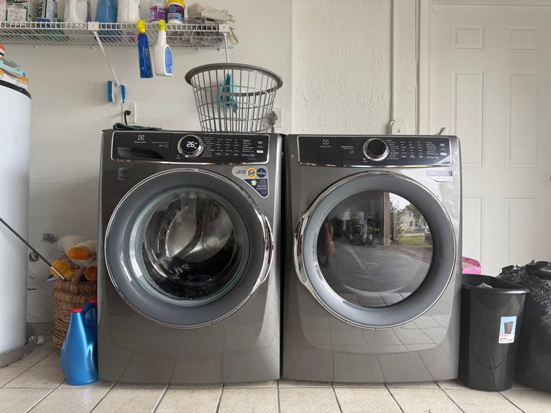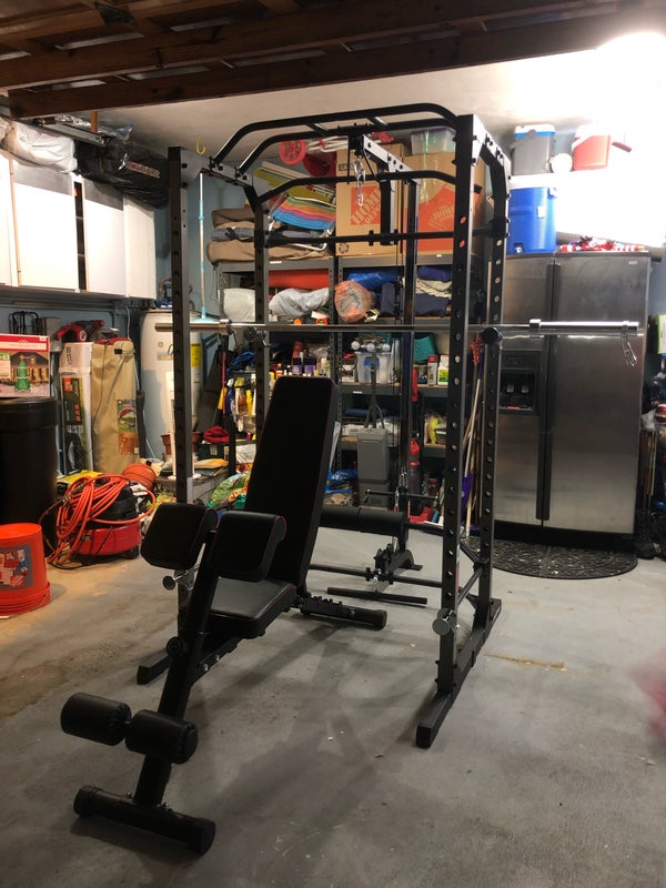 Amenities include access to a washer/dryer and home gym. Full squat rack with bench, cable machine, dumbbells, and stationary exercise bike.