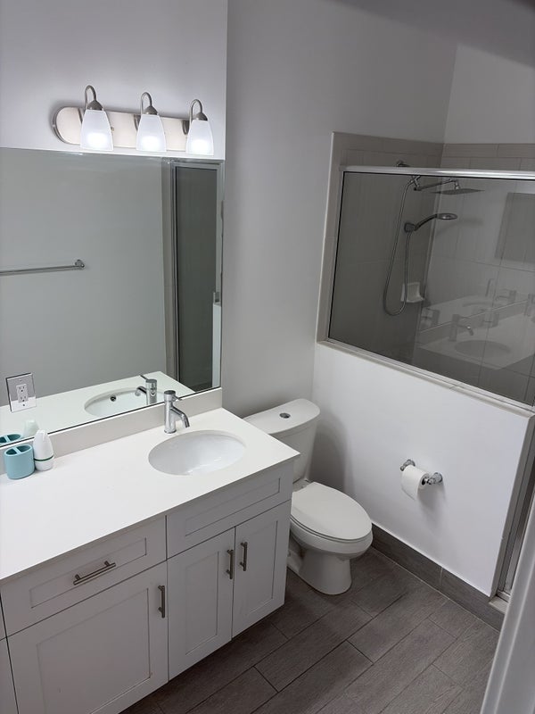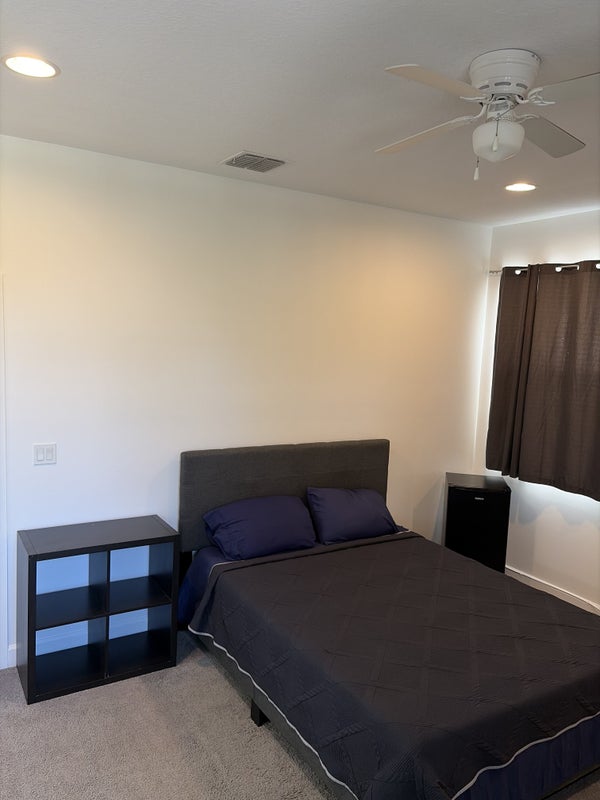 SUITE FEATURES ✓ Modern queen-size bed ✓ Office desk workspace ✓ Private bathroom — double quartz vanity ✓ Flat screen TV with cable ✓ Oversized ceramic tile shower ✓ Large mirror ✓ Refrigerator & freezer in room ✓ Furnished & move-in ready ✓ Microwave & coffee machine