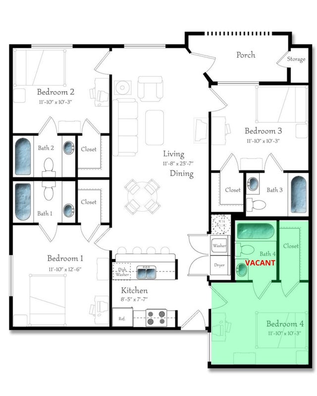 Fully furnished, freshly painted bedroom available in a bedroom, allensuite apartment at Countryside at the University (across from the UF cows). Each bedroom has its own private bathroom, while the living room and kitchen are shared. In the kitchen and refrigerator, each roommate has designated, labeled cabinets to keep everything organized. The condo also includes inunit laundry with a fullsize washer and dryer.