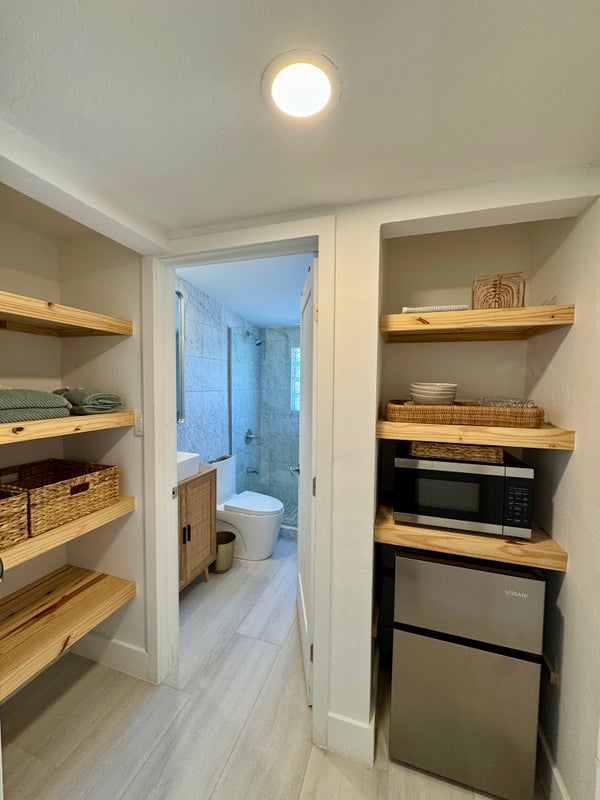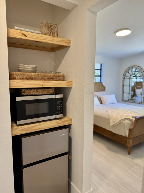 The space is thoughtfully set up and includes: • Comfortable furnishings • TV • Mini fridge • Microwave • Private bathroom