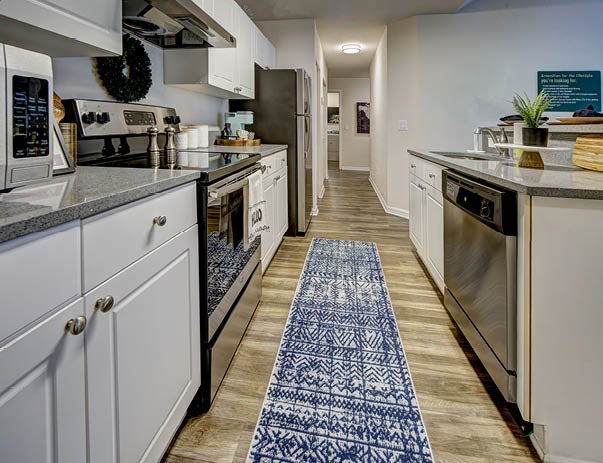 Fully furnished private bedroom: full-sized bed, dresser, nightstand, study desk and chair, walk-in closet Fully furnished living room: leather-style sofas, entertainment center, coffee and end table Full-sized kitchen: dining area with chairs, stainless steel appliances, full-sized refrigerator, oven, dishwasher, microwave Full-sized washer and dryer