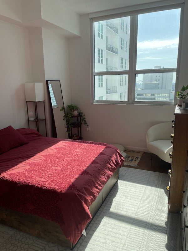 This is the master bedroom of a two bed/two bath condo downtown. It is a spacious corner loft unit that is very quiet and secluded while being in the heart of Downtown Miami. The condo is a 5 min walk from Whole Foods, close to Bayside Marketplace and the Flagler Street Mall.
