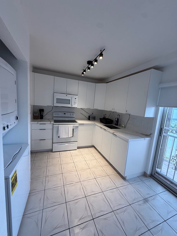 The apartment is bright, recently furnished, and fully equipped for comfortable shared living. It features a modern kitchen with appliances, cookware, and dishes, a living and dining area, and the convenience of an in-unit washer and dryer.