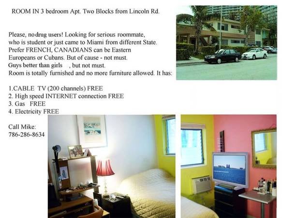 Preferably guys can reply! No drug users, party goers - preferably working serious guys! Can be someone who just moved to Miami or student from Europe. Will be sign roommate contract minimum for 1 year. Room has WiFi and all furniture no more furniture allowed. $850 a month plus one month deposit. Call Mike