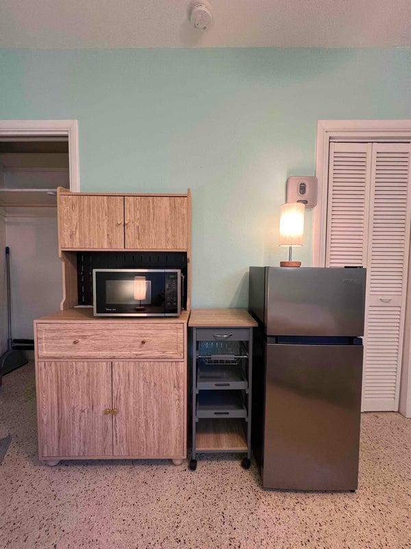 Room comes furnished including tv, microwave, refrigerator and window AC. Walking distance to the beach.  Ready to move in.