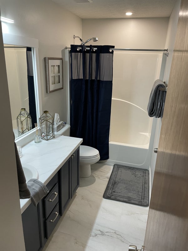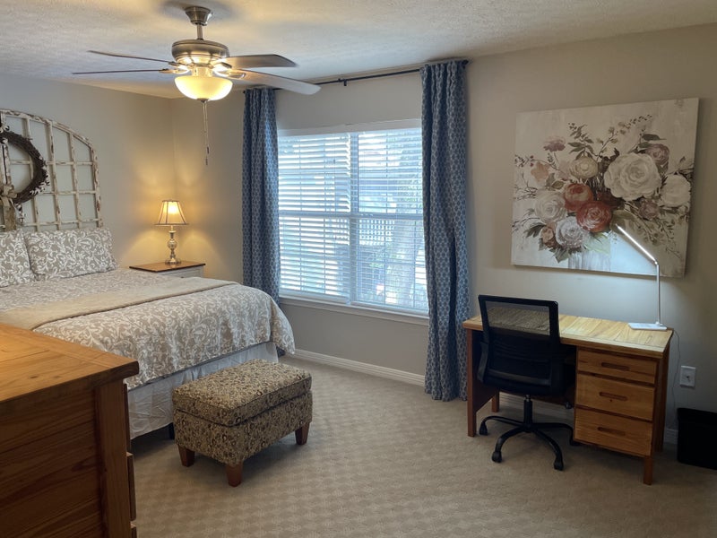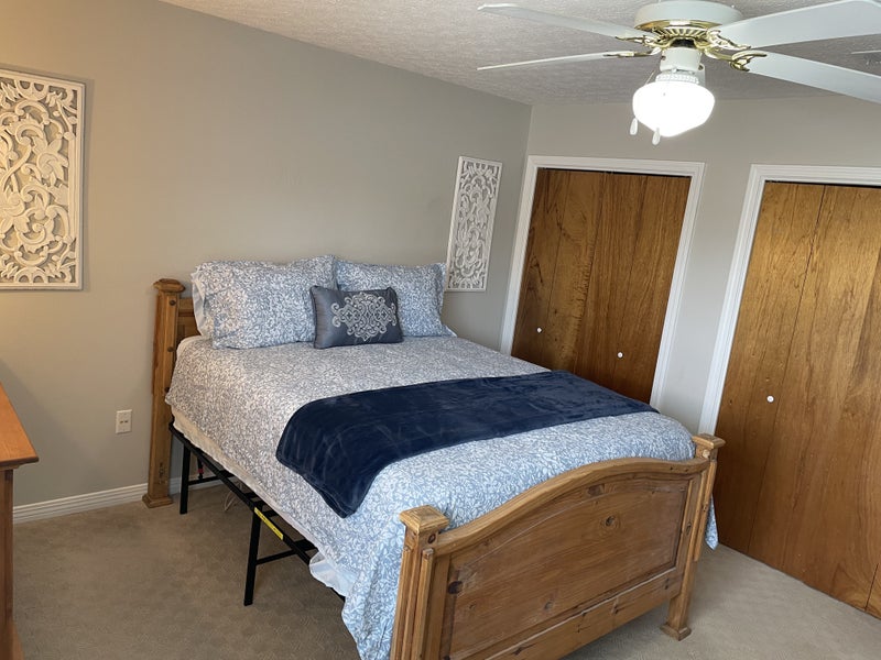 Room availability depends on vacancy: Jun 20 = upstairs tan bedroom with shared bathroom $1,100/mo or Aug 2 = downstairs bedroom with private bathroom $1,200/mo. All bedrooms are spacious 12'x 15’ with queen bed and bedding, nightstand, lamps, desk/chair, two dressers or closets, mirror, ceiling fan, HEPA air purifier, blinds and blackout curtains.