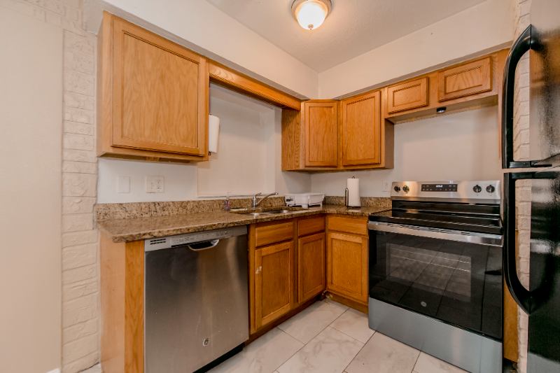 The kitchen is equipped with a fridge, sink, oven, stovetop, as well as basic cookware. It’s the perfect spot for you to cook at home and save money.
