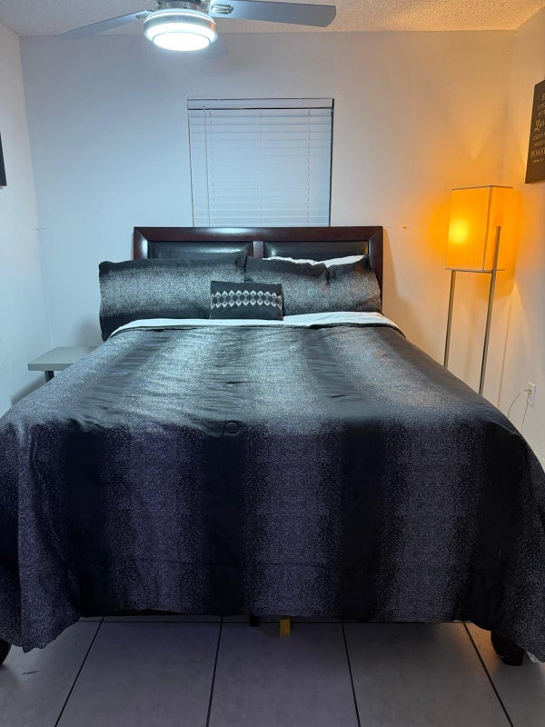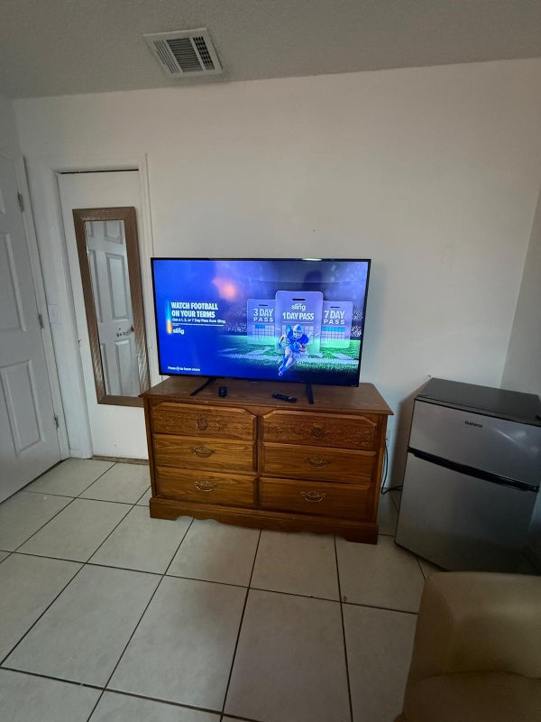 🛏️ Includes: ✅ Bed ✅ Dresser ✅ Nightstands ✅ Compact refrigerator with freezer (inside the room) ✅ TV with Fire Stick