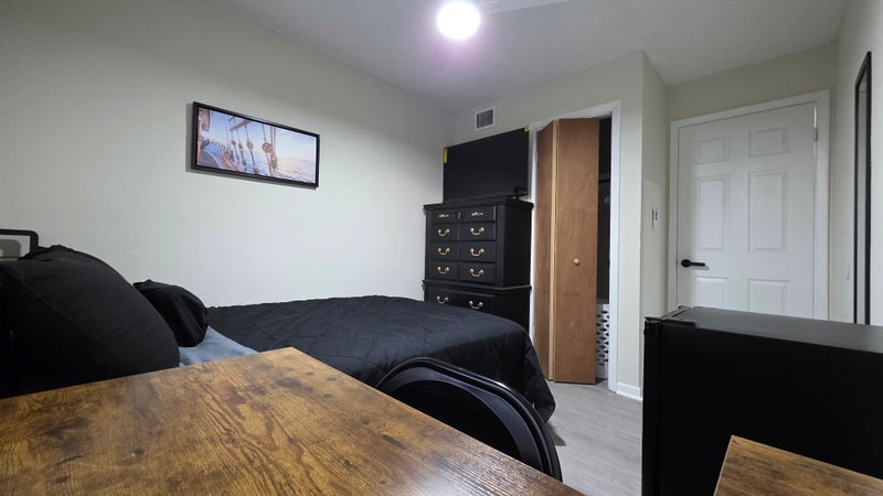 Comfort & Storage: Stay cool with a modern white ceiling fan. The room also includes a dresser, a fulllength mirror, and a wallmounted clothing rack for your wardrobe.