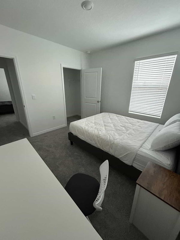 Fully furnished bedroom with queen bed, closet, desk and nightstand located in Wesley Chapel Mirada Lagoon community (10 minutes from Saint Leo University & 25 minutes from USF Tampa). Access to laundry, kitchen and shared bathroom.