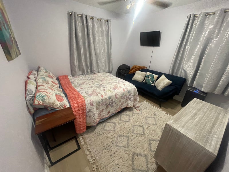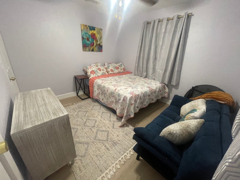 The room being rented comes with a comfy queen bed, a futon, air purifier (we have them in each room), smart TV on the wall, closet etc. The bedroom gets the MOST sunlight out of all the rooms in the house. Beautiful black out curtains already hung. Rooms on the opposite side of the house to ours, for extra privacy.