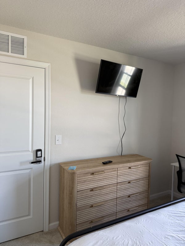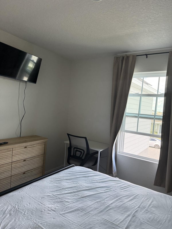 The private room is fully furnished and includes a queen-size bed, dresser, nightstand, smart TV, closet, and a secure keypad lock for added comfort and safety.