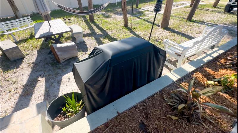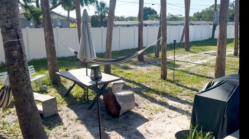 The home features a fully renovated bathroom with all new fixtures and a clean, modern kitchen. Outside, enjoy a fencedin front yard with a relaxed outdoor setup, including hammocks, lounge chairs, a picnic bench, and an onsite gas grill available for all residents to use.