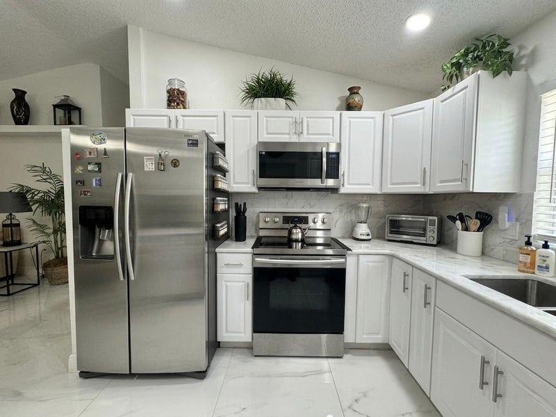 THE HOME: Openconcept living with vaulted ceilings, a stone fireplace with mounted Smart TV, skylights, and marblelook tile throughout. Renovated kitchen with stainless steel appliances and two fullsize refrigerators. Inunit washer and dryer, fenced backyard with fire pit, security cameras for added safety, driveway parking with street overflow. Central AC. Strictly smokefree.