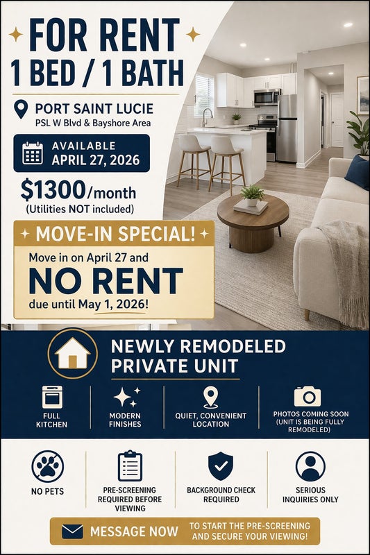 FOR RENT BED BATH Port Saint Lucie PSL W Blvd & Bayshore Area Available April $month (Utilities NOT included) MOVE‑IN SPECIAL: Move in on April and NO RENT due until May , ! Newly Remodeled Private Unit • Full kitchen • Modern finishes • Quiet, convenient location • Photos coming soon (unit is being fully remodeled) No pets Pre‑screening required before viewing Background check required Serious inquiries only Message now to start the pre‑screening and secure your viewing!