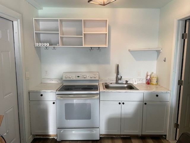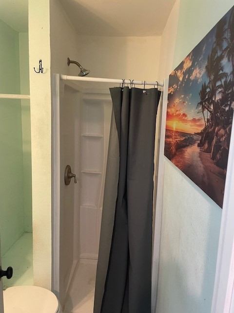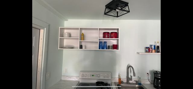 Contemporary lighting and fan Bathroom has white modern tile with showercloset and sink cabinet, , main room is vinyl plank flooring. Modern upper cabinets, ovenstove, refrigerator.