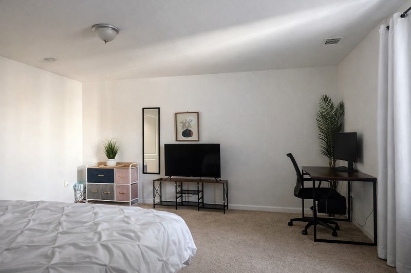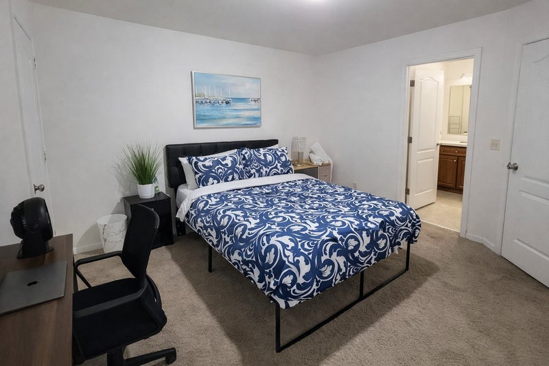 Each bedroom has: office desk, executive chair, and monitor for remote work
