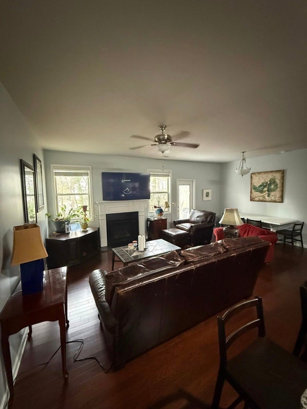 Living room is fully furnished with couches, some wall art, TV, plants, etc.