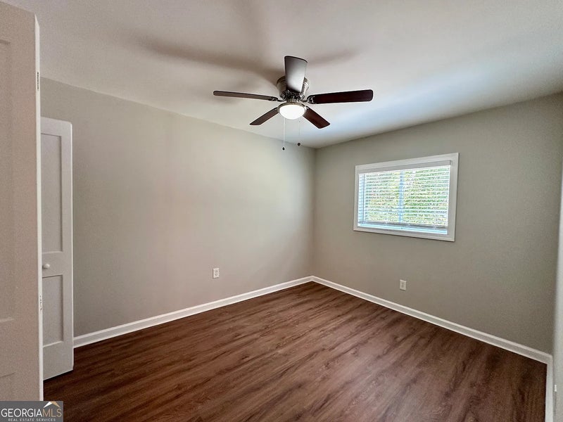 Upgraded vinyl plank flooring, cozy bedroom color, ceiling fan with lighting and natural light.