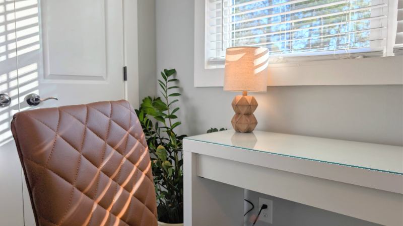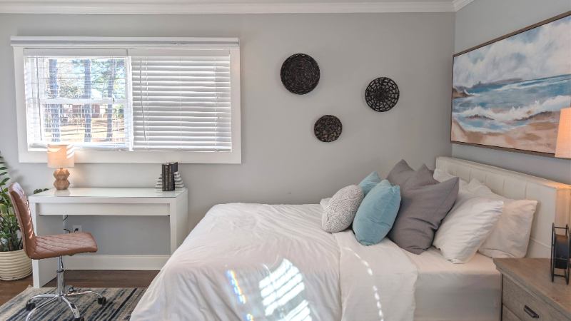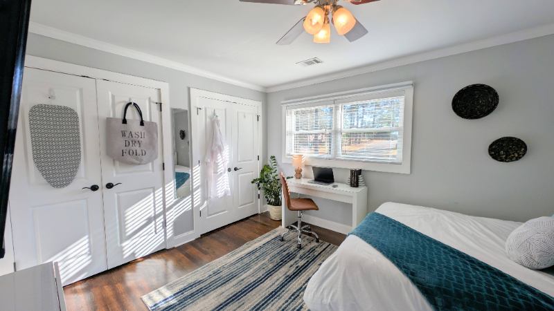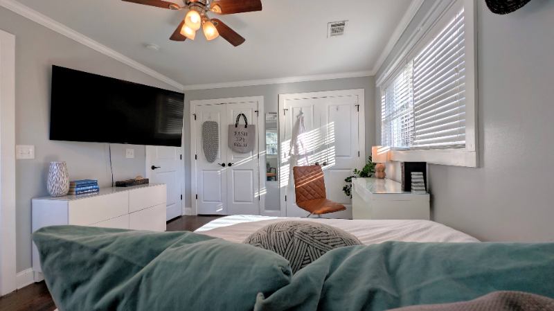 Furnishings: Features a Queensize bed, a inch Smart TV, a corner chair, and a professional workspace with a leather chair.