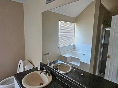 The first bedroom has a share bathroom with one male renter. The second bedroom is a large master with its own bath and separate shower, the bedroom has two walk-in closets. The house has a large Kitchen, Family room and a living room which is shared by all that rent. The house was build in 2001, with a two car garage. There is street parking and parking in the drive way. There is a back patio with trees that lining the back of the yard for privacy. The house is kept very clean and neat. Washer and dryer is included. Lastly there is a half bath on the ground level