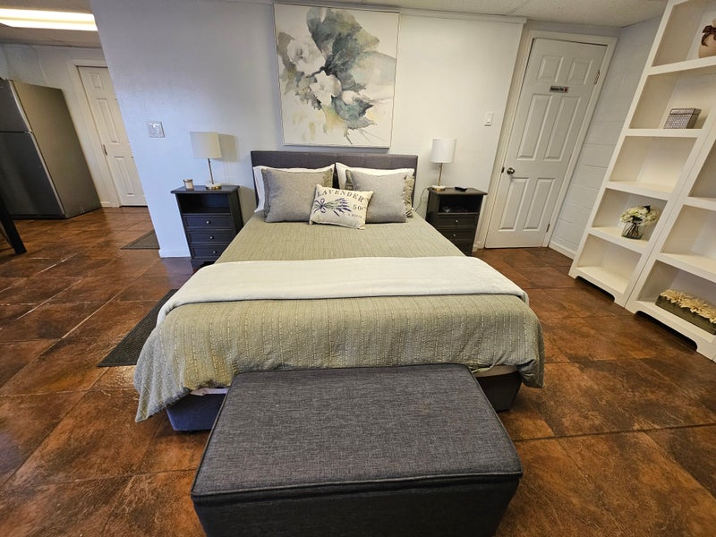 Welcome to this thoughtfully designed one-bedroom studio home that feels both contemporary and comfortable. Crafted for creatives, professionals, and those seeking an inspiring retreat, this charming hideaway features a cozy living area with plenty of seating, and stylish tile floors. It has a functional layout that ensures everything you need is right where it should be, sleek, minimal, and intentional.