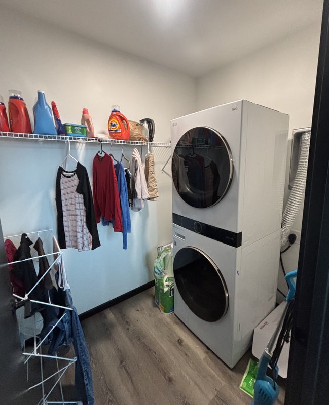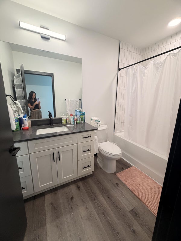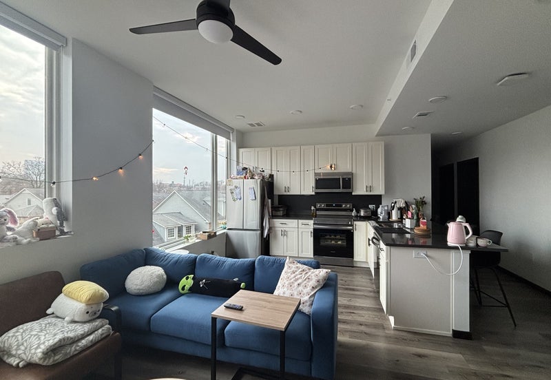 fully furnished one bed one bath in a 4x4 all female unit (college students), full kitchen, living room with large TV, amenities are $20-30 a month, study rooms and movie lounges on every floor, washer and dryer in unit